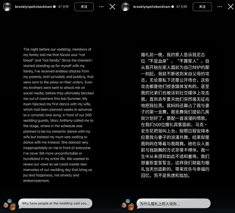 布鲁克林态度如此决绝,与其母亲维多利亚的强势管教密不可分。即便在他成婚之后,维多利亚仍希望这对夫妻为其品牌活动站台,并企图重新打造他们的公众人设。长期积压的情绪终于爆发,酿成今日局面。